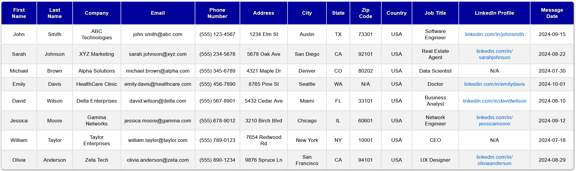 - Extracts complete contact info including first name, last name, email gender, and occupation